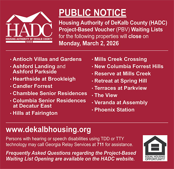 Housing Authority of DeKalb County (HADC) Project-Based Voucher (PBV) Waiting List for Starnes Senior Residences (Elderly Age 62+) will open on Friday, December 5, 2025. The waitlist will close on Friday, January 2, 2026.